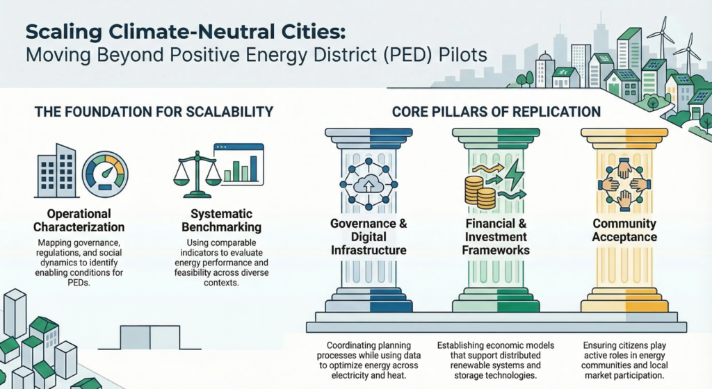 Positive Energy Districts (PEDs) are emerging as a key instrument in Europe’s transition toward climate-neutral cities. However, scaling PED concepts beyond individual pilot sites remains a major challenge. While technological solutions are advancing rapidly, replication requires a deeper understanding of the operational conditions, governance models, and systemic factors that shape district-level energy systems.
